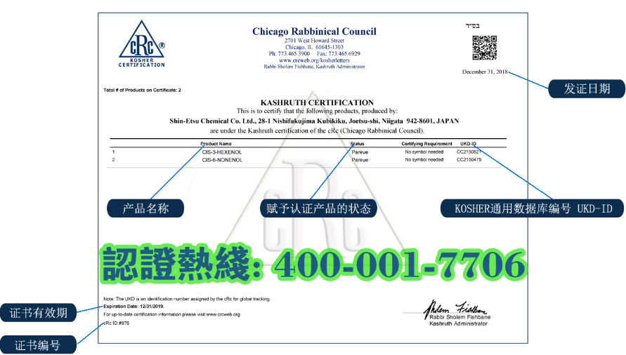 更多Kosher认证知识和申请请直接致电cRc-Kosher中国认证热线:400-001-7706